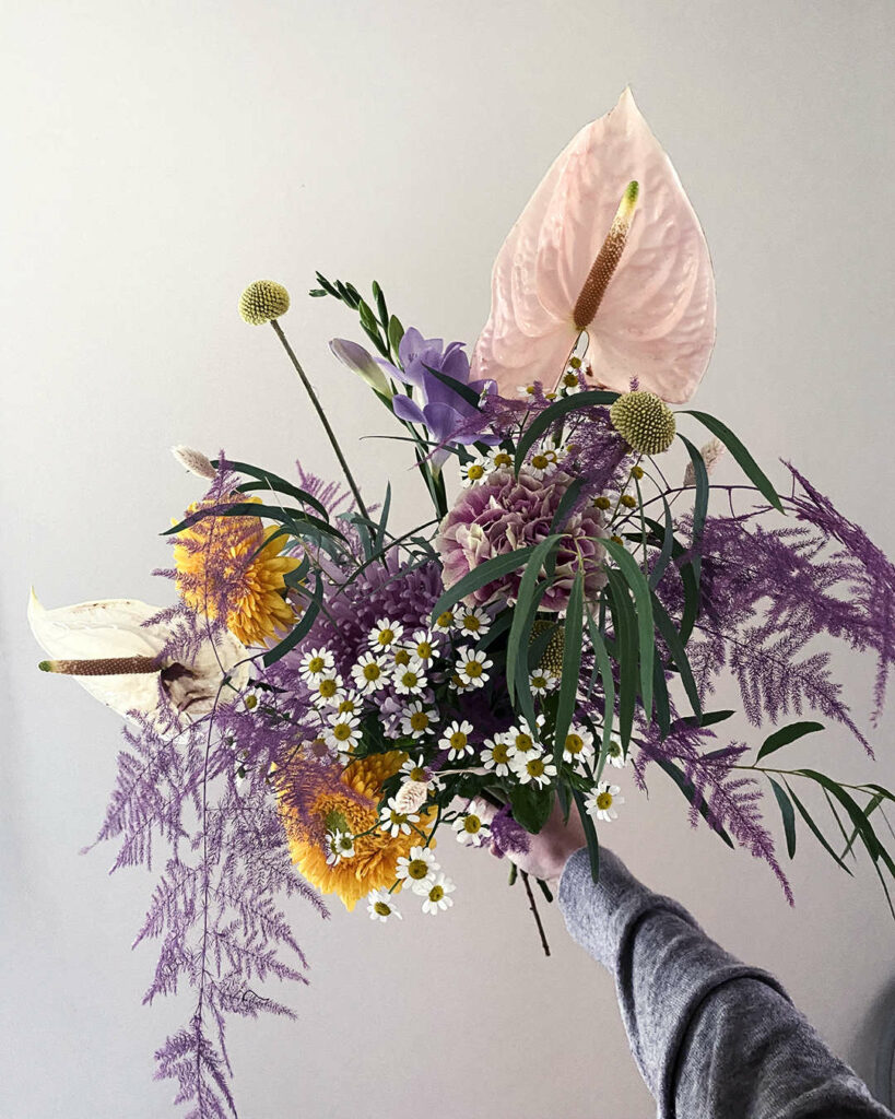 På uppdrag av Nordiska Galleriet skapade vi en härligt ”fyverkeri” av blommor utifrån ledorden ”gul” och ”eklektisk”. Det blev en vacker bukett med gula solbollar, rosa kryssantemum, vita kallor, lavendelfärgad fresia, orange gerbera pompom, prästkragar, nejlika i spräckligt rosa, aprikosfärgade strån och en grön smal-bladig variant av eucalyptus. För att förstärka varumärket ytterligare valde Nordiska Galleriet att placera sin karaktäristiska gula logga på det lyxiga vita omslagspapperet.